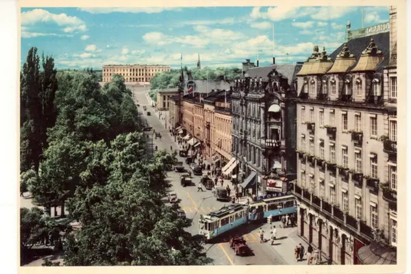Karl Johans gate fra Grand Hotel, langs Eidsvolls plass til Universitetet og Slottsbakken. Hotel Nobel. Kontor- og forretningsgårder. Trikk inn fra Rosenkrantz' gate, biler, spaserende. Postkort.
