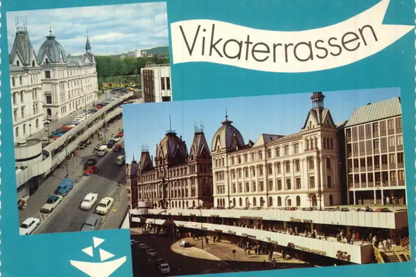 Victoria terasse og Vikaterrassen langs Ruseløkkveien. Utenriksdepartementets nybygg (fra 1963). Butikker, butikkskilt. Biler parkert og i trafikk. Postkort med to motiver.