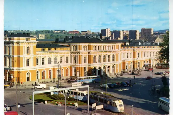 Østbanebygningen sett fra Strandgata og Christian Frederiks plass. Trikk, Gullfisktog i sløyfe, busser, biler. Blokkene på Enerhaugen og Tøyenhøyden i bakgrunnen. Postkort.