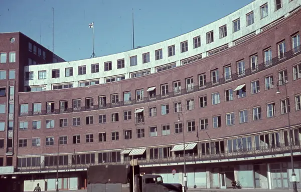 Fritjof Nansens plass, borggården ved Rådhuset. Tysk miitært flagg på taket. Avblendete vinduer i første etasje. Militær lastebil. Sannsynligvis fotografert av tysk soldat under krigen.