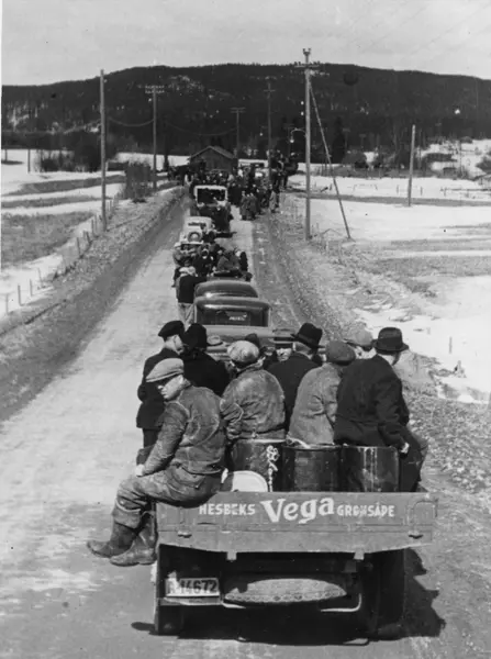 Panikkdagen 10. april etter rykter om bombing av Oslo fra britiske bombefly. Presis klokken 11.30 onsdag 10. april 1940 gikk flyalarmen. Folk på flukt i biler, lastebiler og til fots mot Grefsenåsen og Lillomarka. Lastebil med reklame for Hesbeks Vega grønsåpe, kjennetegn: A-14672