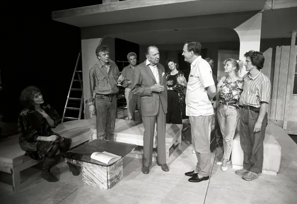 Scene fra Nationaltheaterets oppsetning av Alan Ayckbourns "Monki Bisniss". Ken Ayres og Umberto, Giorgio, Orlando, Vincenzo eller Lotario Rivetti snakker sammen. Rundt står en gruppe kvinner og menn og ser på dem. Forestillingen hadde premiere 8. september 1989. Toralv Maurstad hadde regi og medvirkende var blant annet Tor Stokke som Jack, Kari Simonsen som Poppy og Leif Juster som Ken Ayres.