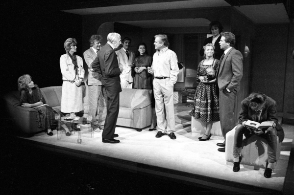Scene fra Nationaltheaterets oppsetning av Alan Ayckbourns "Monki Bisniss". Elleve kvinner og menn kledd for fest står i en gruppe, der de prater og drikker. I forgrunnen sitter en ung mann og leser. Forestillingen hadde premiere 8. september 1989. Toralv Maurstad hadde regi og medvirkende var blant annet Tor Stokke som Jack, Kari Simonsen som Poppy og Leif Juster som Ken Ayres.