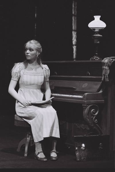 Scene fra Nationatheaterets oppsetning av Henrik Ibsens "John Gabriel Borkman". Frida Foldal sitter ned noteblader i henden foran et piano. Forestillingen hadde premiere 3. februar 1979. Per Bronken hadde regi og medvirkende var blant annet Knut Wigert som John Gabriel Borkman, Astrid Folstad som Gunhild Borkman, Wenche Foss som Ella Rentheim og Linn Stokke som Frida Foldal.