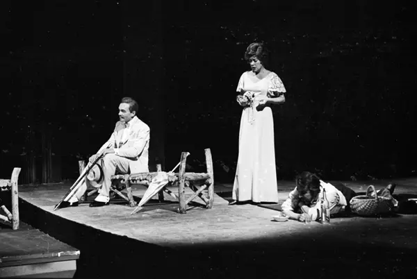 Scene fra Nationaltheaterets forestilling av Anton Tsjekhovs "Kirsebærhaven". Forestillingen hadde premiere 22. september 1971. Jan Kacer hadde regi og Lubos Hruza kostymer og scenografi.