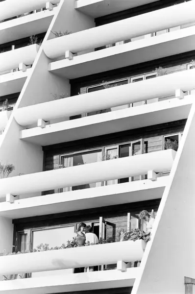 Mennesker står på en terrasse i en terrasseblokk på Vestli.
