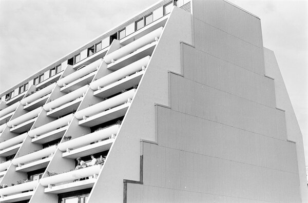 Mennesker står på en terrasse i en terrasseblokk på Vestli.