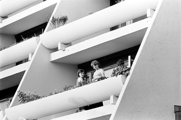 Mennesker står på en terrasse i en terrasseblokk på Vestli.
