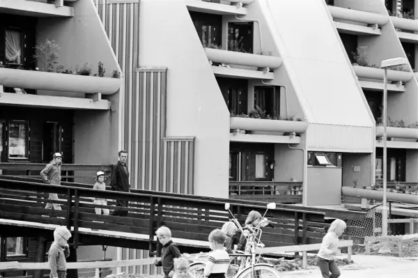 Barn leker utenfor terrasseleiligheter på Vestli.