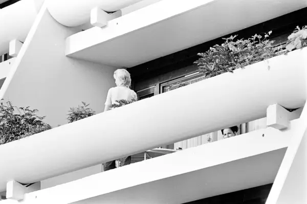 Mennesker står på en terrasse i en terrasseblokk på Vestli.