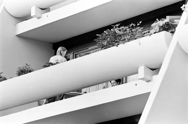 Mennesker står på en terrasse i en terrasseblokk på Vestli.