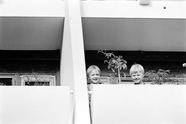 Mennesker står på en terrasse i en terrasseblokk på Vestli.
