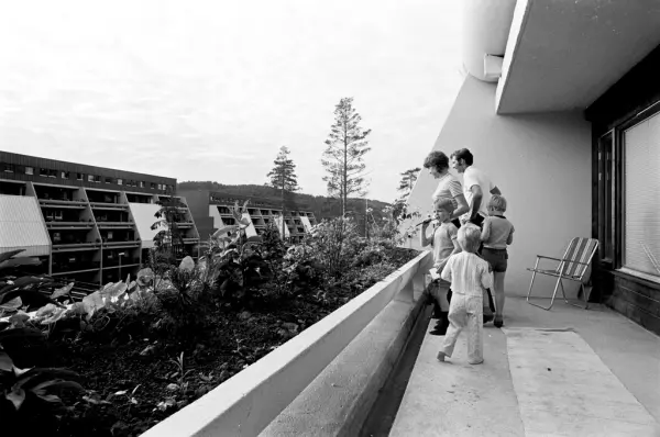 Mennesker står på en terrasse i en terrasseblokk på Vestli.
