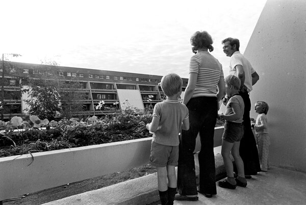Mennesker står på en terrasse i en terrasseblokk på Vestli.