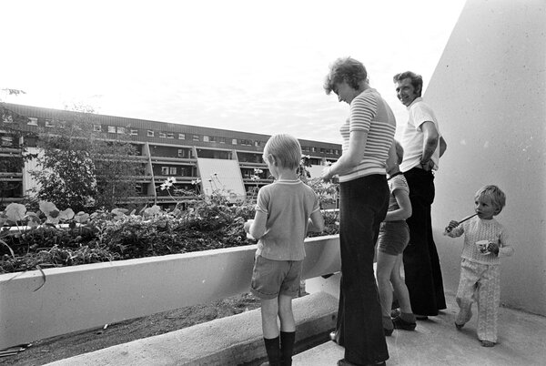Mennesker står på en terrasse i en terrasseblokk på Vestli.