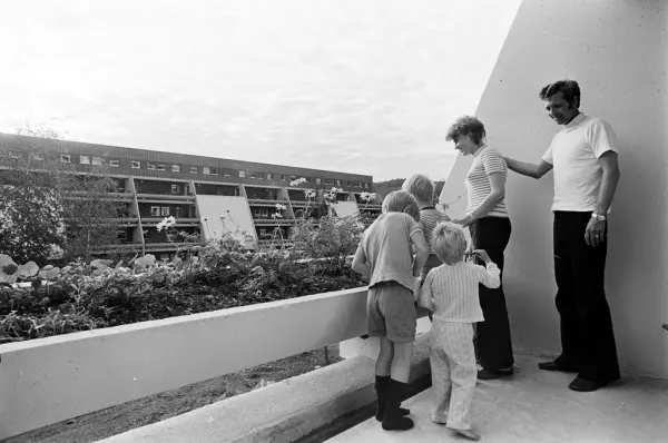 Mennesker står på en terrasse i en terrasseblokk på Vestli.