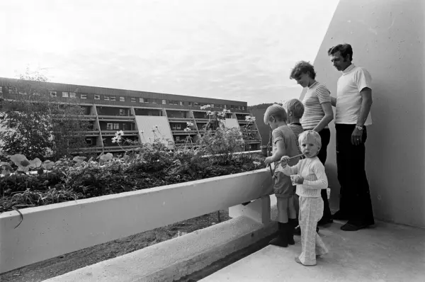 Mennesker står på en terrasse i en terrasseblokk på Vestli.