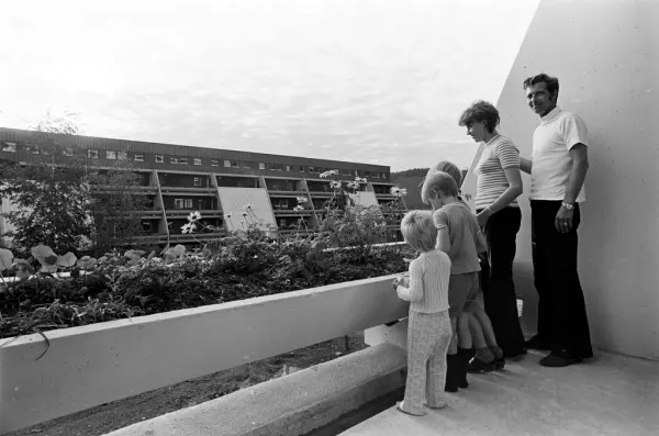 Mennesker står på en terrasse i en terrasseblokk på Vestli.