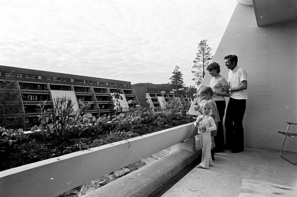 Mennesker står på en terrasse i en terrasseblokk på Vestli.