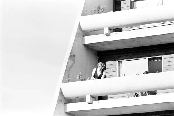 Mennesker på terrasse i terrasseblokk på Vestli.