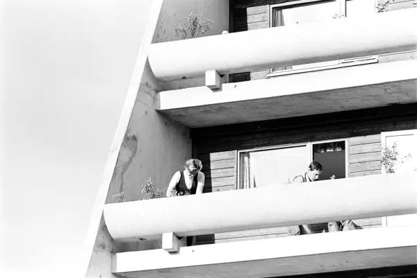 Mennesker på terrasse i terrasseblokk på Vestli.
