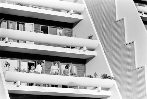 Mennesker på en terrasse i en terrasseblokk på Vestli.