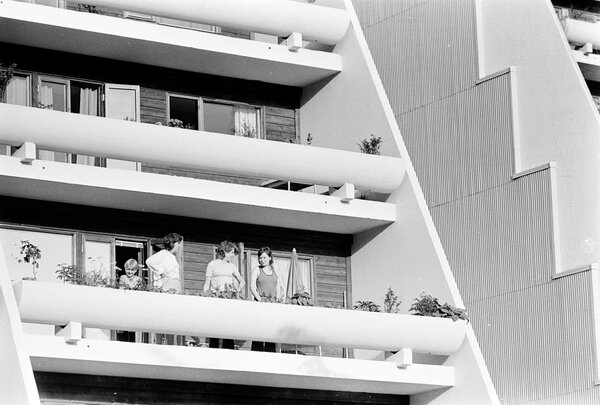 Mennesker på en terrasse i en terrasseblokk på Vestli.