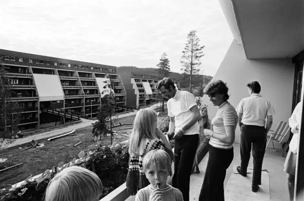 En gruppe mennesker står på en terrasse i en terrasseblokk på Vestli.