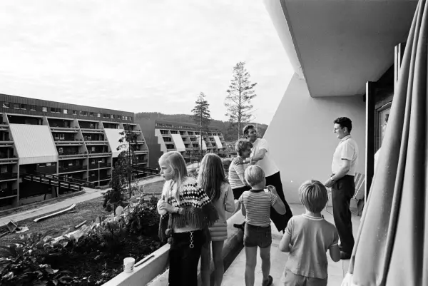 En gruppe mennesker står på en terrasse i en terrasseblokk på Vestli.