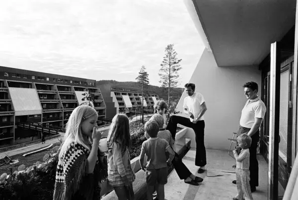 En gruppe mennesker står på en terrasse i en terrasseblokk på Vestli.