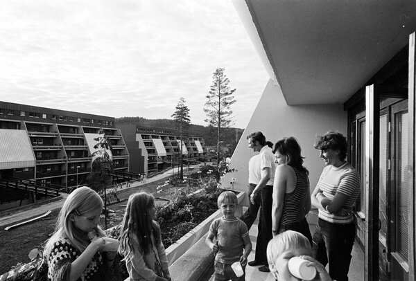 En gruppe mennesker står på en terrasse i en terrasseblokk på Vestli.