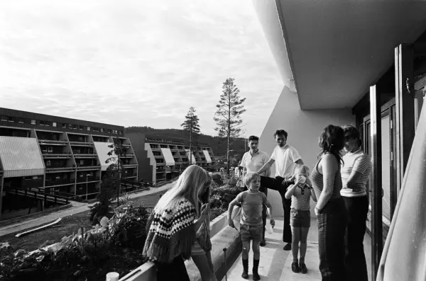 En gruppe mennesker står på en terrasse i en terrasseblokk på Vestli.