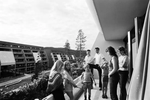 En gruppe mennesker står på en terrasse i en terrasseblokk på Vestli.