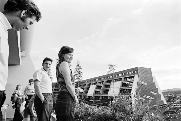 En gruppe mennesker står på en terrasse i en terrasseblokk på Vestli.