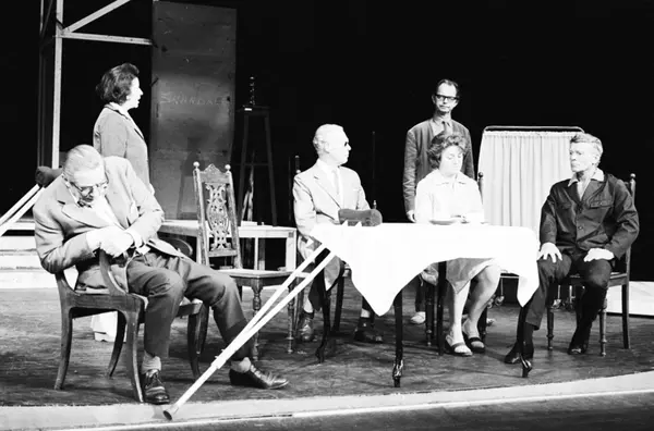 Scene fra Nationatheaterets oppsetning av August Strindbergs "Spøksonaten". Forestillingen hadde premiere 26. september 1979. Stein Winge hadde regi, Lubos Hruza scenografi og kostymer var ved Per Lekang.