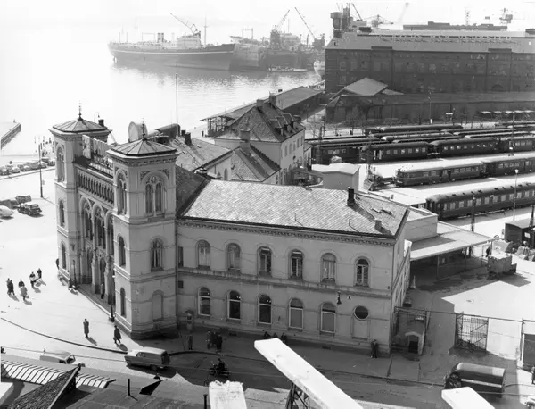 Utsikt mot Vestbanebygningen (1872), med Aker mekaniske verksted og Pipervika i bakgrunnen.