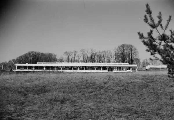 Arkitekturfoto av Økern Aldershjem. Arkitektene Fehn og Grung fikk i 1961 Houens fonds diplom for sin tegning av bygningen. Bilde av bygningen i landskapet.