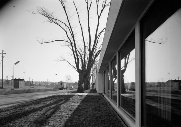 Arkitekturfoto av Økern Aldershjem. Arkitektene Fehn og Grung fikk i 1961 Houens fonds diplom for sin tegning av bygningen. Bilde av de store glassvinduene og omegn.