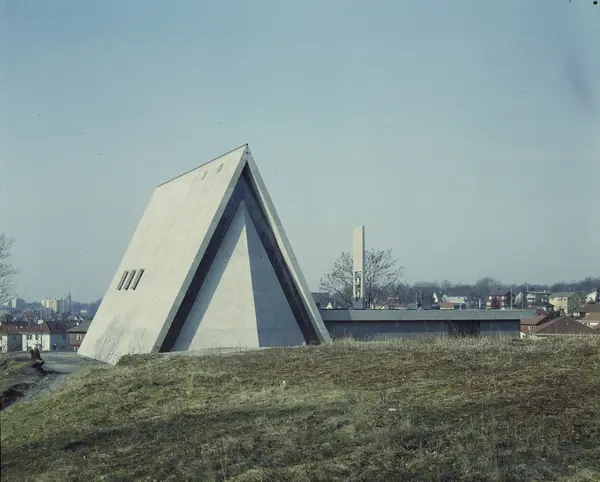 Eksteriørbilde av Bakkehaugen kirke i Oslo. Kirken ble opprinnelig tegnet av arkitekt Ove Bang, som vant konkurransen i 1940. Erling Viksjø modifiserte tegningene etter krigen og kirken sto ferdig i 1959. Utsmykninger av Kai Fjell og Carl Nesjar.