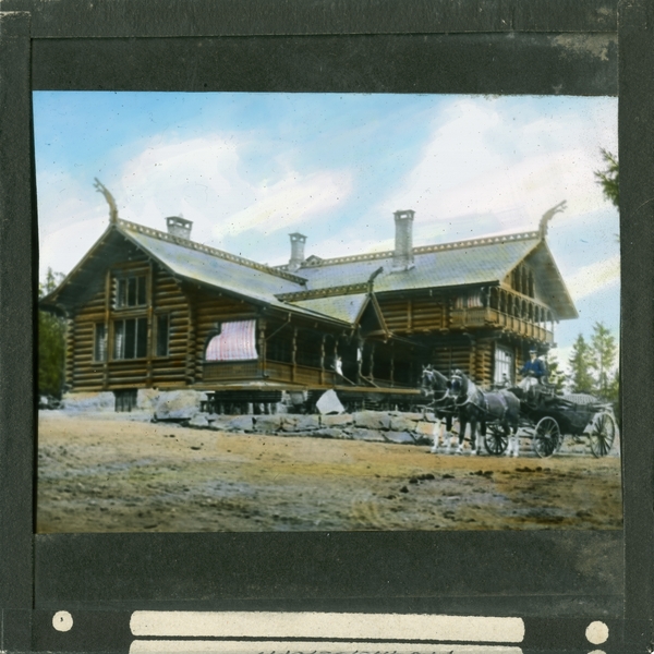 Håndkolorert dias av Frognerseteren restaurant. Foran står en vogn spent for med to hester. En kusk i uniform sitter i vognen. På restaurantens veranda står en kvinne i hvit kjole.