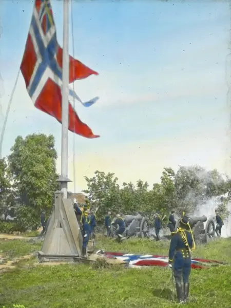 Håndkolorert dias. To offiserer overvåker firingen av unionsflagget på Akershus festning 9. juni 1905. Soldater lader to kanoner som avfyrer salutt.