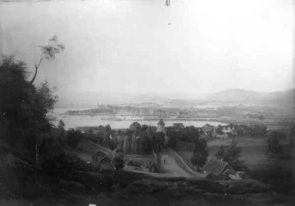 Oslo. Utsikt over byen og fjorden fra Ekeberg. "Den Kulturhistoriske Udstilling i Kristiania 1901" på NF.