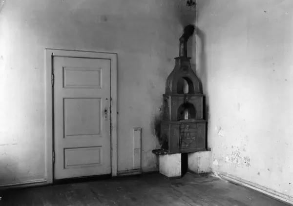 Akersgata 44, Oslo. Dåpsrommet i den gml.Fødselsstiftelse. Dør og etasjeovn.