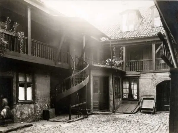 Kirkegata 7, Oslo. Bakgårdsbygning med svalgang, vindeltrapp og dragkjerre.