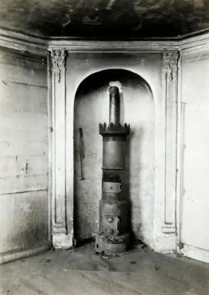 Interiør med ovn fra Stiftsgården i Rådhusgata 13, Oslo. Seinere del av Bysamlingen på Norsk Folkemuseum.