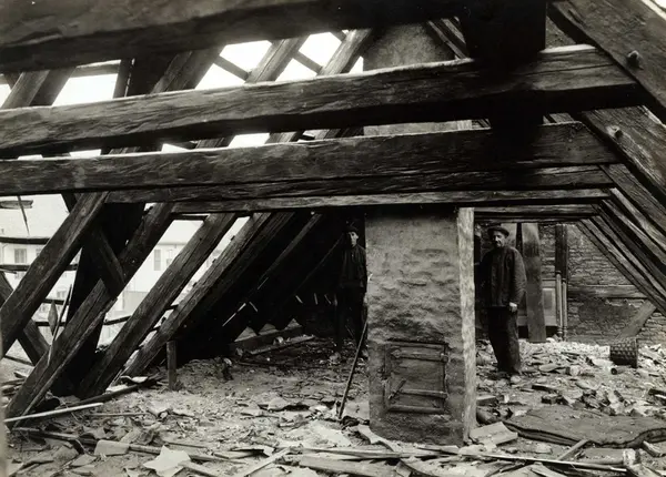Tollbugata 14, Oslo. Hus under riving, fra taket. To arbeidmenn. Nå på Norsk Folkemuseum. Håndtverkergården/Bokbindergården.