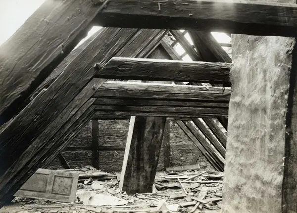 Tollbugata 14, Oslo. Hus under riving. Fra taket. Nå på Norsk Folkemuseum. Håndtverkergården/Bokbindergården.