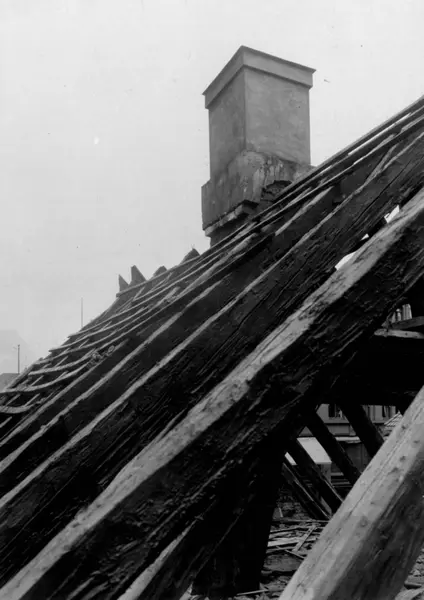 Tollbugata 14, Oslo. Hus under riving. Taket. Nå på Norsk Folkemuseum. Håndtverkergården/Bokbindergården.