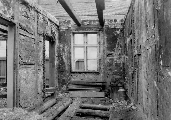 Tollbugata 14, Oslo. Hus under riving. Interiør. Nå på Norsk Folkemuseum. Håndtverkergården/Bokbindergården.