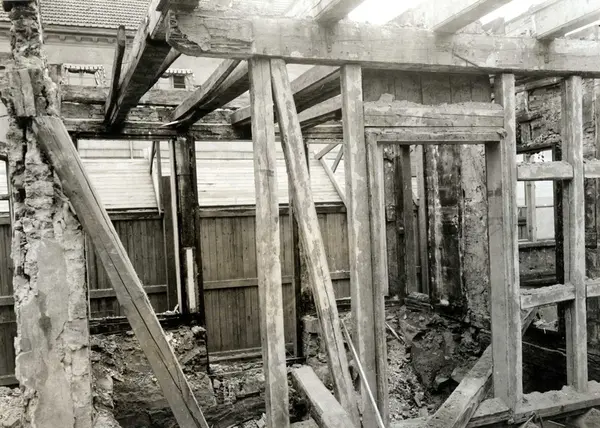 Tollbugata 14, Oslo. Hus under riving. Nå på Norsk Folkemuseum. Interiør med støttebjelker. Håndtverkergården/Bokbindergården.